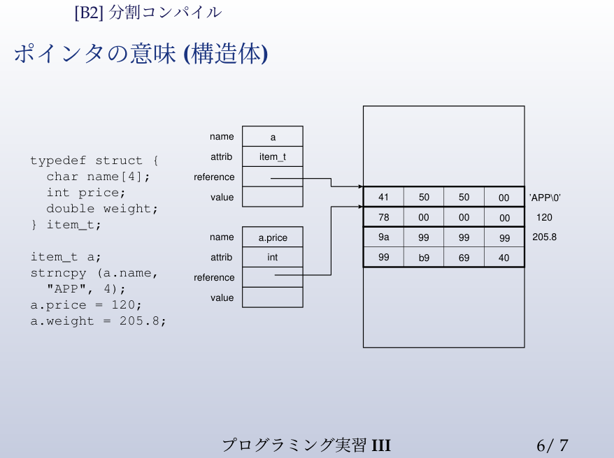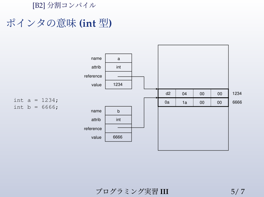 64 ビット OS 上の C コンパイラの int は通常 32 ビットなので、それぞれ 4 バイト。 使用している計算機の CPU は Intel Core Ultra 5 で、 1234 は 16 進数で 0x00001a0a である。 インテルの CPU はリトルエンディアンなので、下位バイトが前に来て、 d2 04 00 00 のように格納されている。