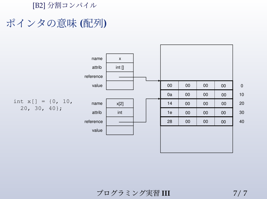 これも、 配列の要素である int 型の 0, 10, 20, 30, 40 が詰めて配置されていることがわかる。 したがって、n 番目の要素は、配列の先頭から 4 * (n - 1) バイト目にある。